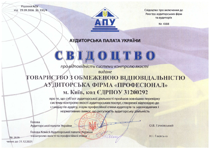 Свідоцтво Аудиторської палати України про відповідність системи контролю якості